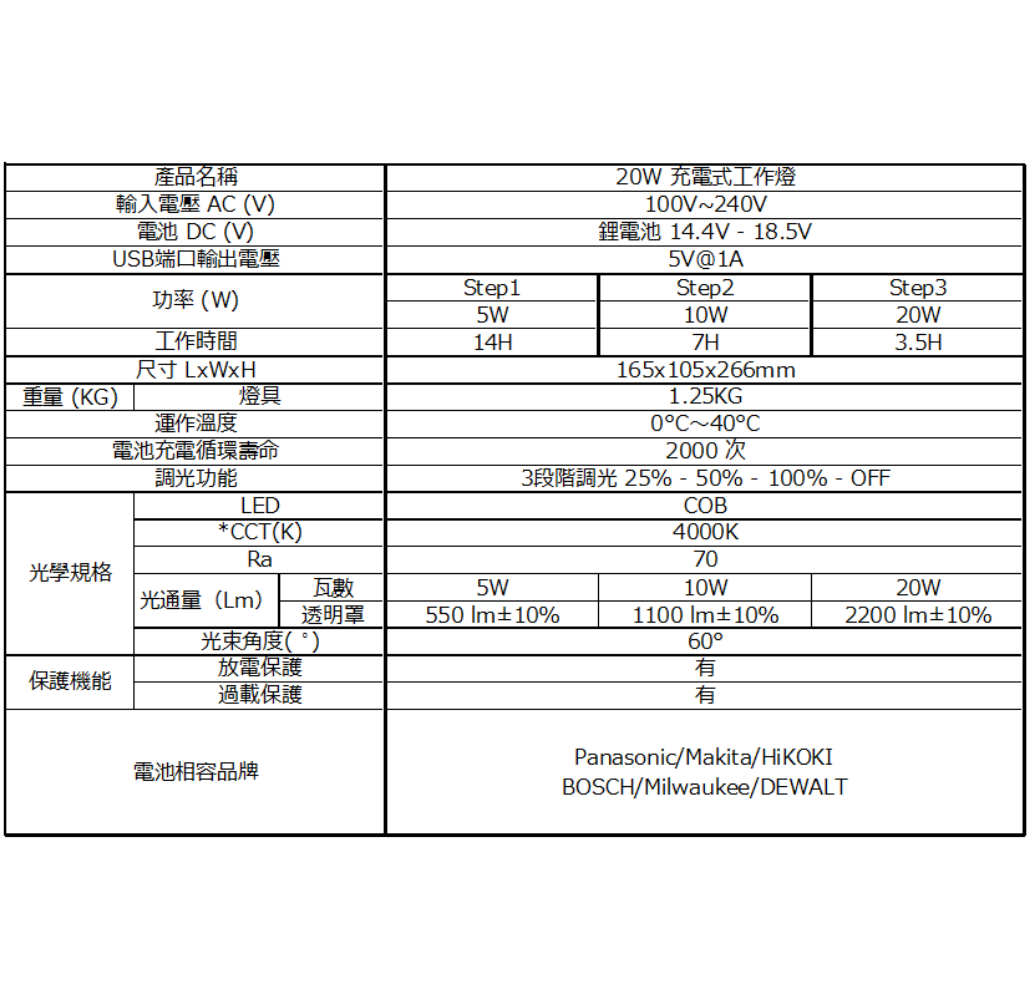 20W 萬用工作燈,最大亮點就是全面支援四大品牌工具機電池(BOSCH、Panasonic、Hikoki、Makita),再也不用為電力相容性煩惱。